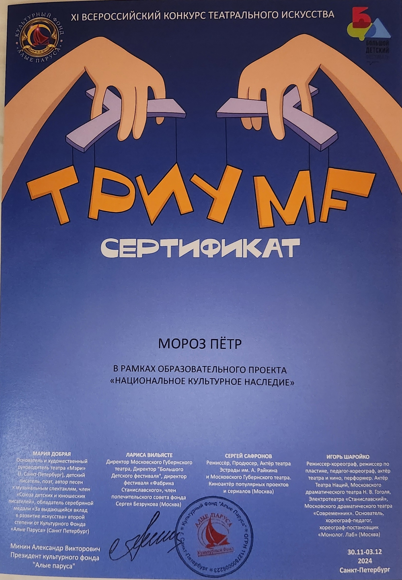 Делимся приятной новостью! Наш воспитанник старшей группы "Почемучки" - Пётр Мороз - принял участие в IX Всероссийском конкурсе театрального искусства "Триумф" в г.Санкт-Петербурге в рамках образовательного проекта "Национальное культурное наследие" под руководством Культурного фонда "Алые паруса" (г.Санкт-Петербург).