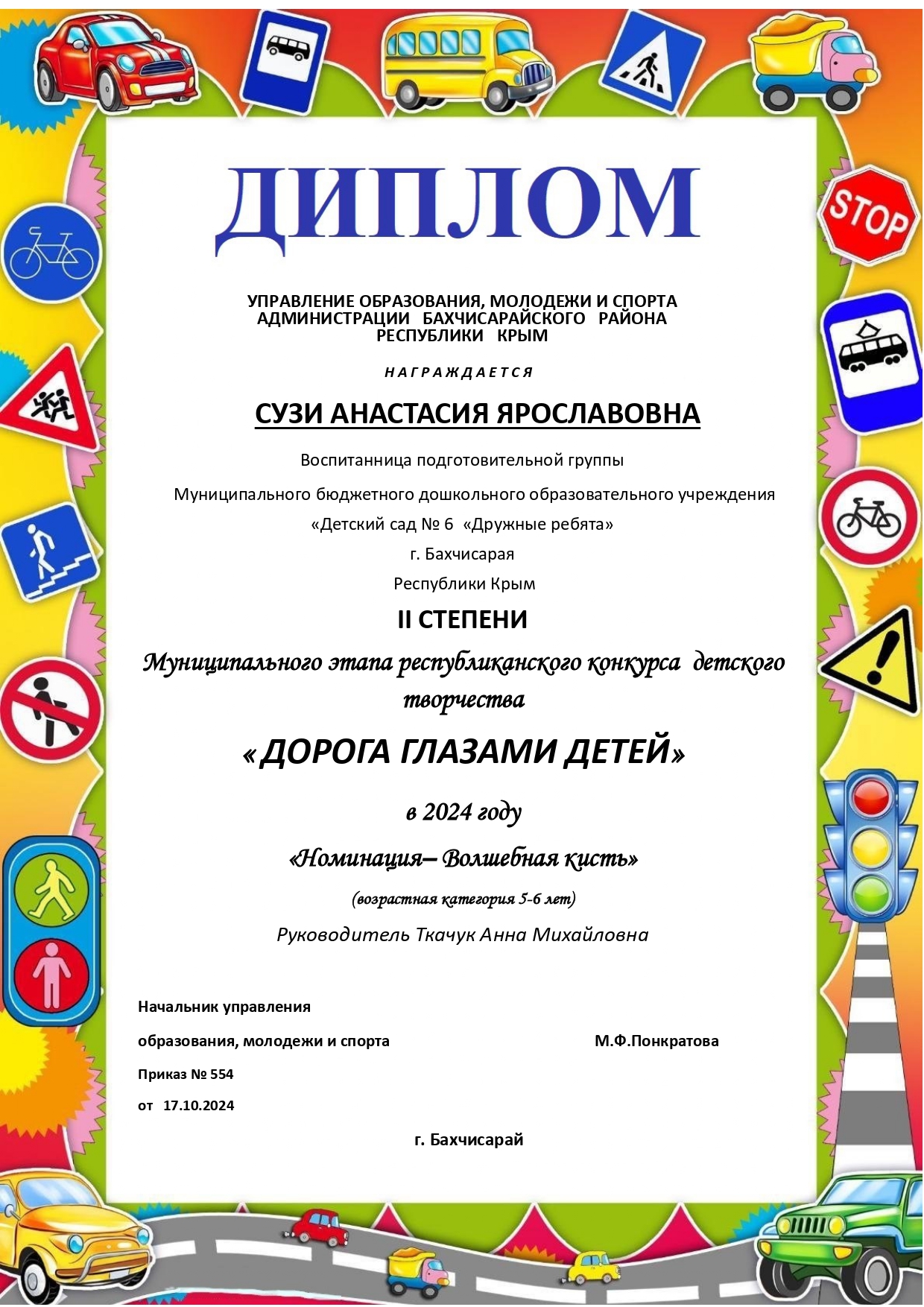 Поздравляем Анастасию Сузи, воспитанницу подготовительной к школе группы", с победой в Муниципальном конкурсе "Дорога глазами детей".