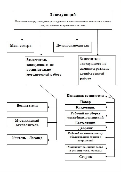 Управленческая деятельность заведующего обеспечивает: материальные; организационные; правовые; социальные; психологические условия для реализации функции управления образовательным процессом в ДОУ. Объект управления заведующего – весь коллектив. Распоряжения заведующего обязательны для всех участников образовательного процесса. Заместители заведующего Учреждением: Гачек Инна Васильевна - заведующий хозяйством. Объект управления – часть коллектива согласно функциональным обязанностям.